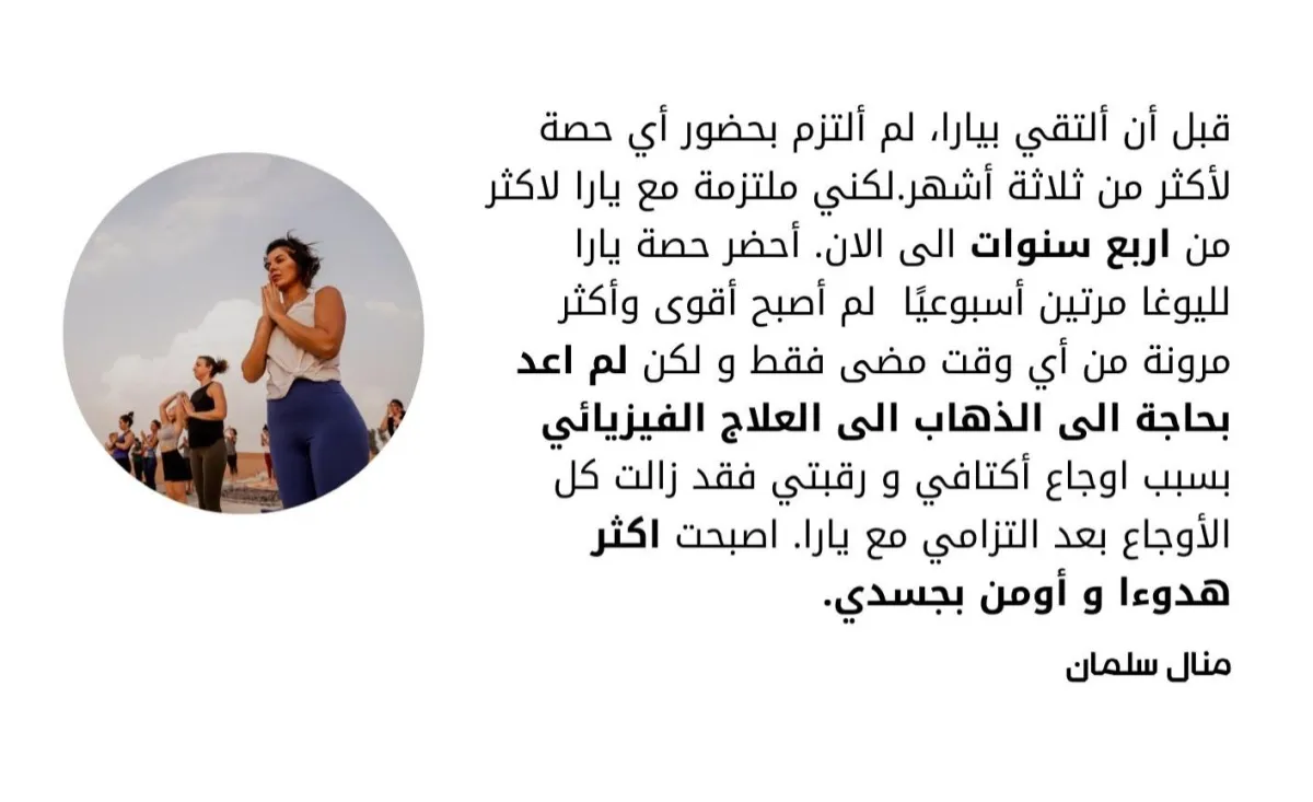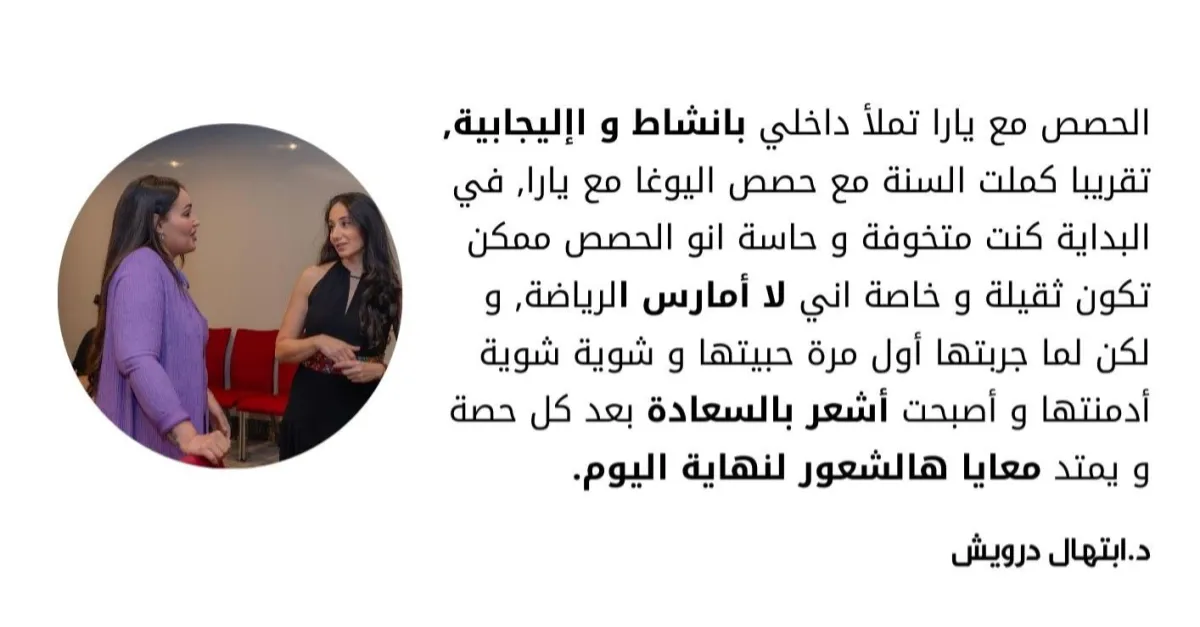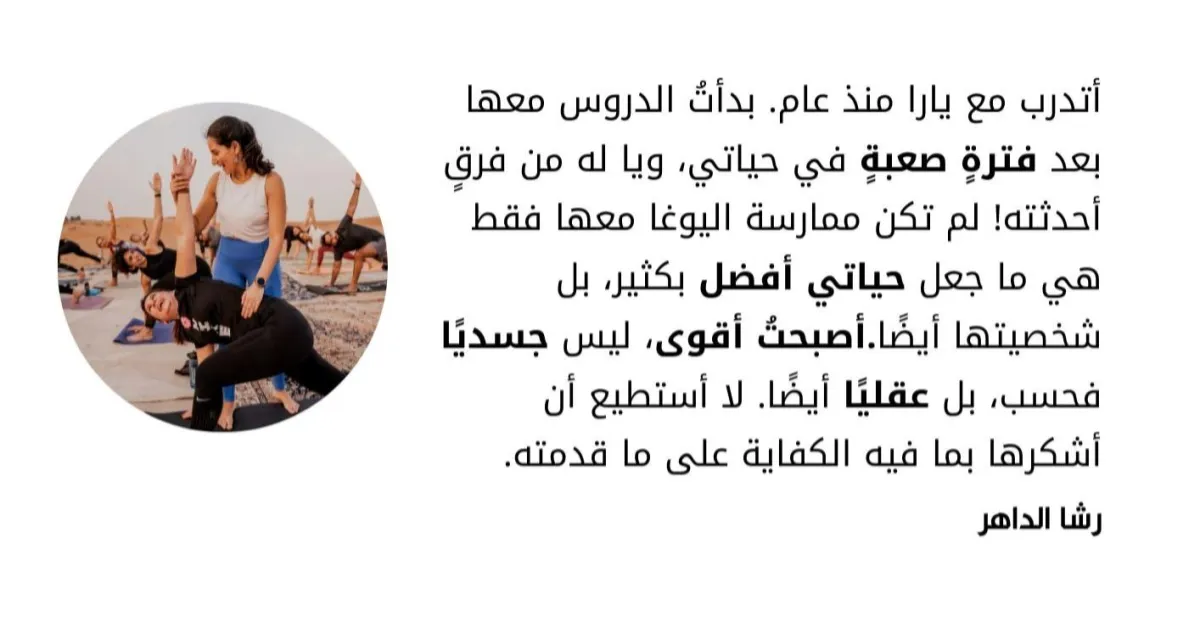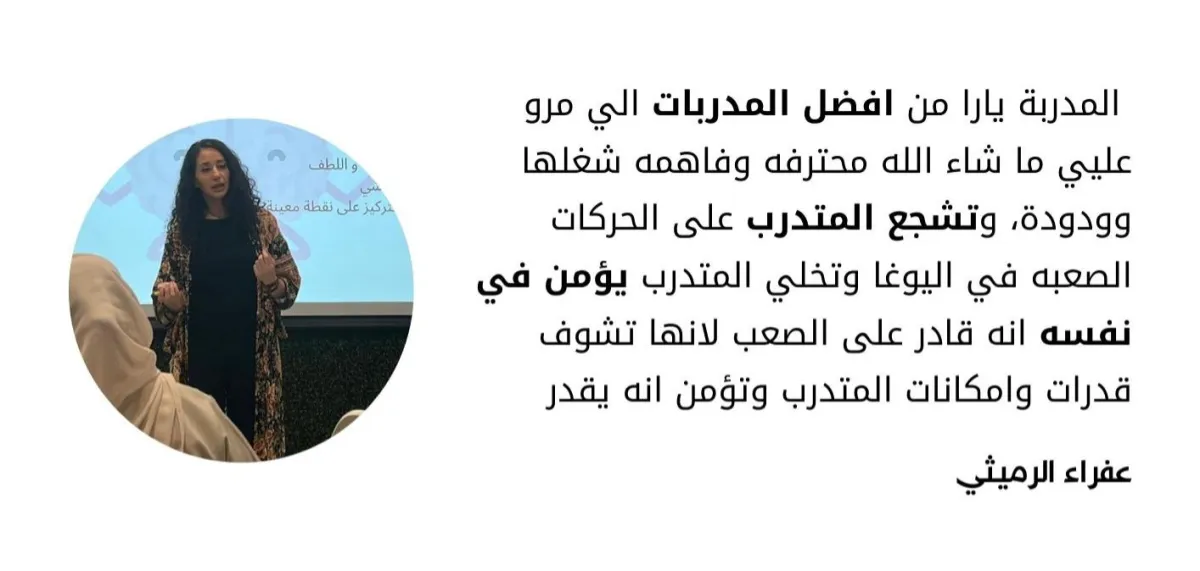 أنا بعلّمك تفهمي جسمك.و أفكارك و تعملين على تحسين حياتك بشكل عام و ليس على جهة واحدة فقط